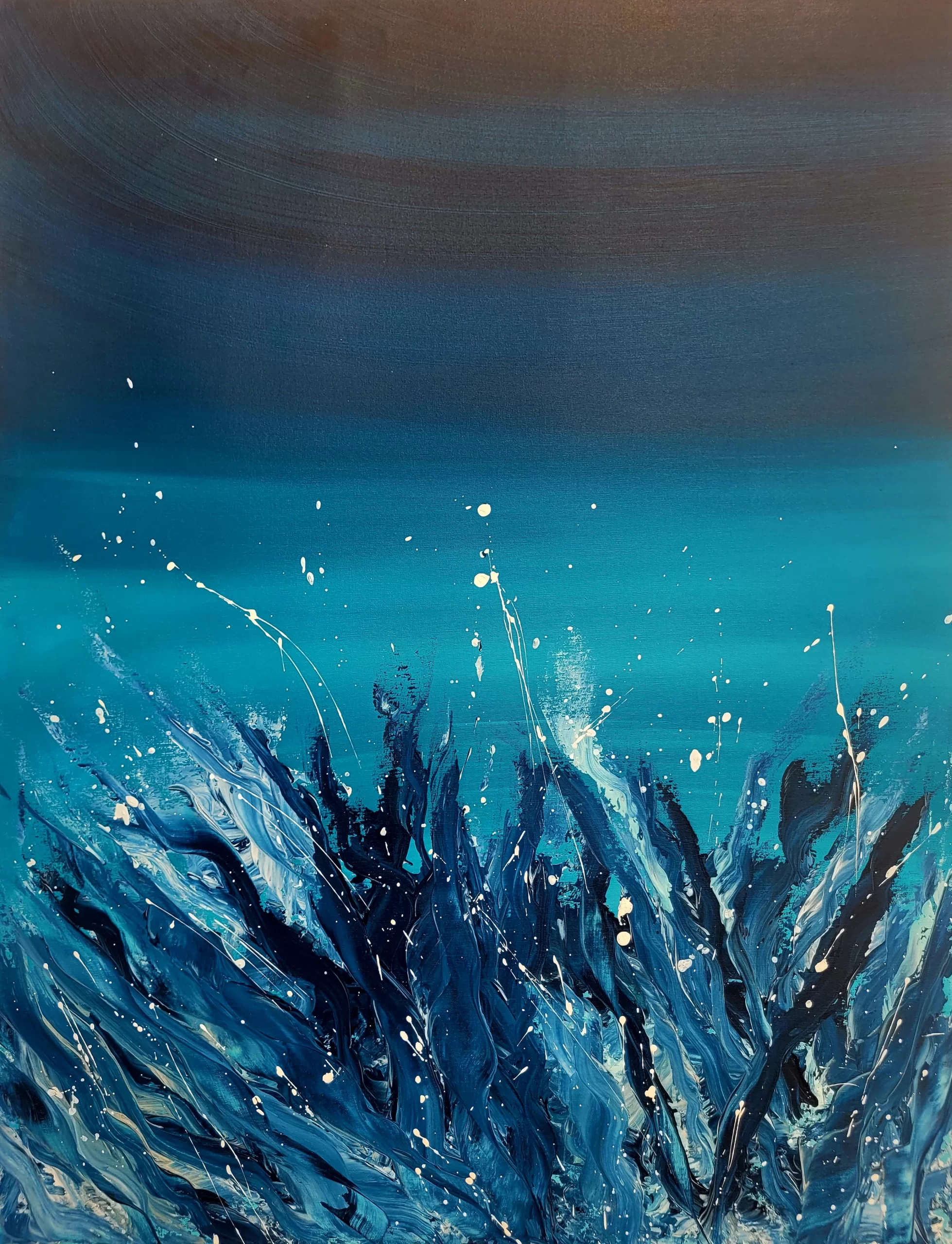 A pintura abstrata Força Azul apresenta gradações de azul-marinho, cobalto e turquesa se entrelaçando em pinceladas vigorosas e texturizadas. O movimento ascendente das formas criou dinamismo e energia, reforçado por respingos brancos que acrescentam ritmo e profundidade ao conjunto. O plano superior, em transição para tons mais escuros, estabelece contraste entre a densidade do fundo e a vitalidade das formas emergentes. A obra explora a fluidez da cor e da matéria, criando um efeito visual de expansão e força orgânica.